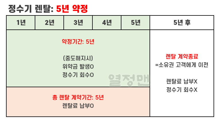 5년이나 6년 약정으로 계약하는 경우에는 약정기간과 렌탈 계약기간이 동일하게 일치하는 조건입니다. 약정기간이 종료됨과 동시에 계약기간도 끝이 나므로 5년이 지나면 소유권 이전이 이루어지죠. (6년 약정은 6년이 지나야 계약 종료)